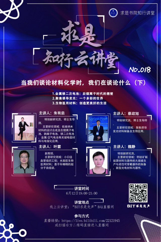 带着这些疑问,6月12日,求是书生在哔哩哔哩平台聆听了求是知行讲堂第十八期——当我们谈论材料化学时,我们在谈论什么?(下)。本期知行云讲堂继续邀请到了材料学院材料物理与化学系的蔡政旭老师、叶霖老师、朱有启老师和魏静老师作为主讲人,为大家讲授关于材料化学的知识,同时也向大家介绍材料物理与化学系,让即将进行专业选择的大一新生对材料物理与化学系有了更深的了解。本次知行讲堂由求是书院与材料学院合办,材料物理与化学系承办,分为上下两期为求是书生进行材料化学的科普讲座。其中,第十七期——当我们谈论材料化学时,我们在谈论什么?(上)已经于6月5日举办。