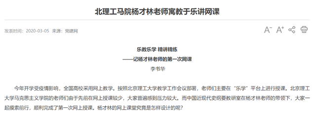 以往杨才林的理论教学强调“三史合一”(校史、军工史、中国近现代史有机融合),今年强调“精讲”;往年实践教学强调“5+1”(读一本经典著作、参观一个博物馆、看一部纪录片、写一个读书报告、做一次课堂演讲,在此基础上做一个微课),今年要求“精练”。在撰写小论文的基础上,要求大家录制配音ppt进行大赛展示,以此充分发挥理工科学生的技术优势。作业通过网上分组,2-4人合作完成,可以突出“抗击疫情中中国特色社会主义制度的优越性”主题,也可以突出“全面建成小康社会”的主题等。