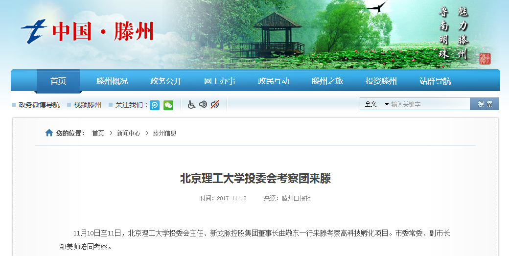 11月10日至11日,澳门太阳城app投委会主任、新龙脉控股集团董事长曲敬东一行来滕考察高科技孵化项目。市委常委、副市长邹美帅陪同考察。