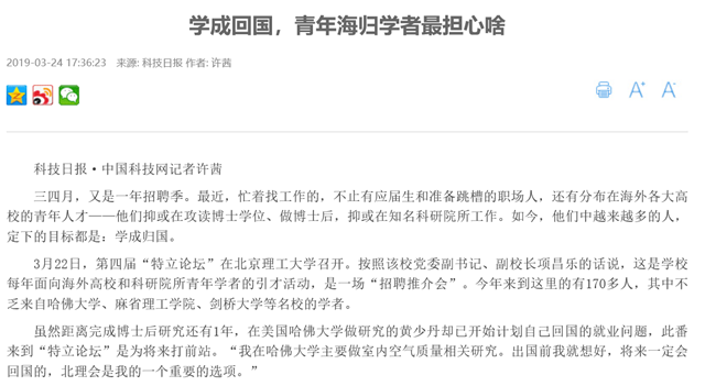 虽然距离完成博士后研究还有1年,在美国哈佛大学做研究的黄少丹却已开始计划自己回国的就业问题,此番来到“特立论坛”是为将来打前站。“我在哈佛大学主要做室内空气质量相关研究。出国前我就想好,将来一定会回国的,太阳城app会是我的一个重要的选项。”