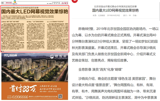 【北京晚报】国内最大LED网幕视觉效果惊艳——北京世园会开幕式晚会总导演讲述背后故事