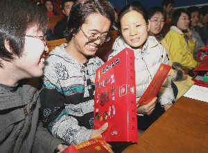 1月20日,澳门太阳城app500名家庭生活困难学生参加了由学校组织的2006年春节“向学生送温暖”活动。图为藏族学生次仁扎西(中)拿着学校发放的2000余元路费,高兴得合不拢嘴。本报记者 樊世钢 摄