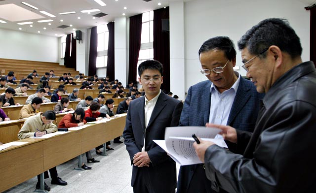 党委书记焦文俊、校长匡镜明到考场了解考试情况。