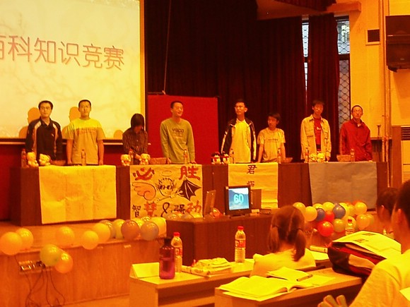 4月15日,初赛在中教举行。经过三个小时的激烈角逐,每位参赛同学都展示出的我理学院莘莘学子,特有的智慧、冷静与胆略。在他们之中,十一同学脱颖而出。除总分前四名晋级决赛,还评出了七项单科第一,他们分别是:文学:05物理班路睿,历史:03信息1班薛雪,地理:05力学班于韶明,体育:04化学班吕俊均,军事:04物理班廖作敏,英语与发散思维:05信息2班李松,知识休闲:05信息1班李鑫。 大浪淘尽始见金。5月14日晚,04力学班项大林,05信息2班康劲,04应用化学班卢凯,04数学1班陈作君四位晋级同学各携一名搭档,共同角逐06年度理学院智慧之星。