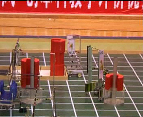 本届大赛在大连大学举行,在预选赛中我校分组抽签与南京理工大学、华南理工大学分在了A组,被称为“理工组”,按比赛顺序正好排在了第一场,成为本届大赛的揭幕战。针对走场形势,指导老师和队员们连夜分析讨论应战策略。比赛时机器人发挥稳定、策略应用得当,高比分胜出南京理工大学代表队,得到现场评委和观众一致好评。