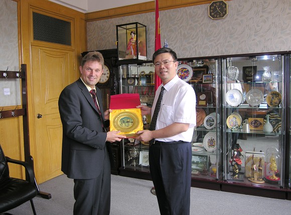 2006年7月24日,德国洛伊廷根大学(Reutlingen University)代表团在副校长Stephan Höfer教授的率领下访问我校,受到赵平副书记的亲切会见。代表团成员包括洛伊廷根大学校议会成员Helmut Schaal教授、生产管理学院院长Joachim Gschwinder教授以及奔驰公司高级经理Fritz Becker先生。
