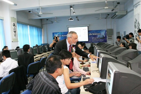 下午在中心教学楼424多媒体教室,由意大利博洛尼亚大学生物技术学院院长Lanfranco Masotti教授和Patrizia Brigidi教授就远程控制技术在生命科学教学中的应用做学术报告,并现场演示。通过网络实现远程控制,操作位于博洛尼亚大学实验室中的仪器,对组织切片和生化指标检测信号进行观察和测量。