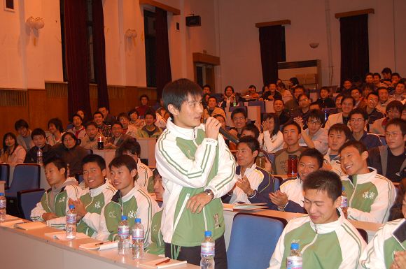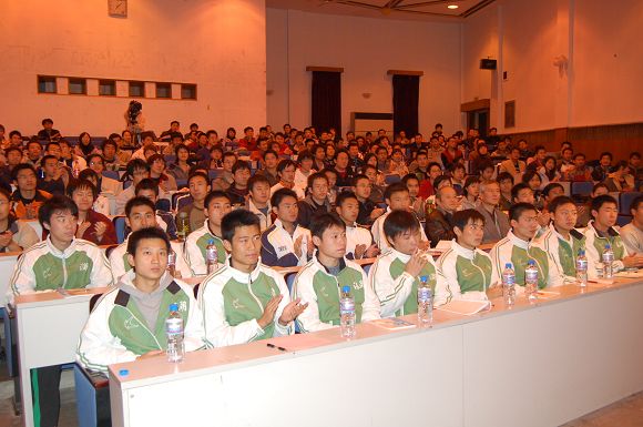 校足球队全体队员也参加了报告会,足球场上的教诲也许已经很多,但这样的报告会对他们来说可能也是第一次。