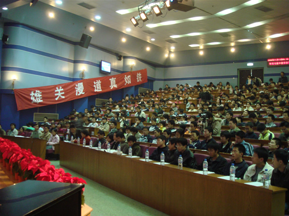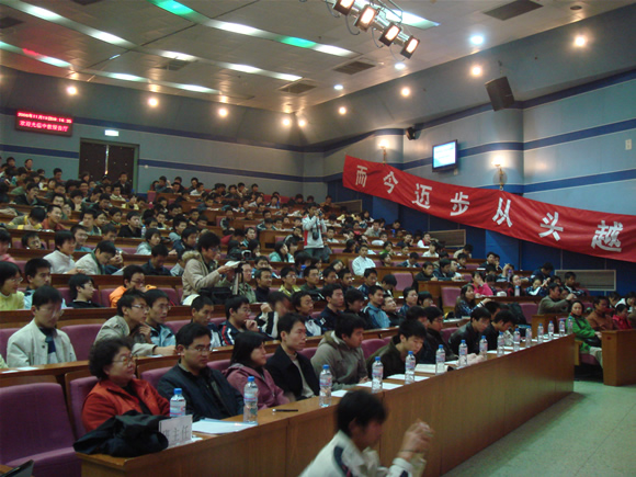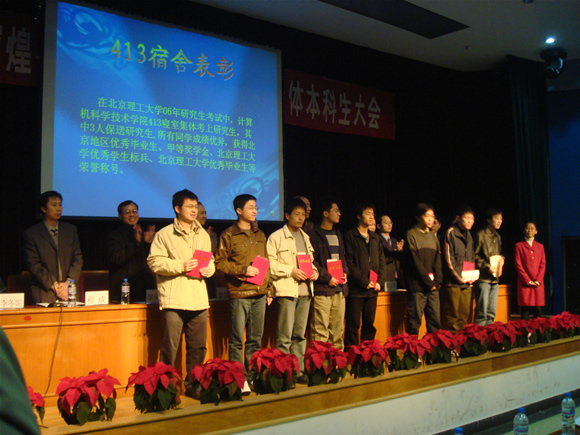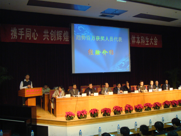 接着,计算机学院优秀学生集体——三义庙413宿舍代表陈磊学长、“趋势百万程序设计竞赛”获奖代表李金峰学长、99级优秀学生代表杜昶旭学长分别和同学们进行了经验交流。他们用自己的亲身经历对怎样在竞赛中取得好成绩、怎样对待大学生活等问题做了精辟阐释。杜昶旭学长的“改变你能改变的,接受你不能改变的”,“知识就是手边的积木”,“To be the best of yourself”等观点的引用在同学们中引起了广泛共鸣。会议还对413宿舍进行了表彰(奖金4000元)。