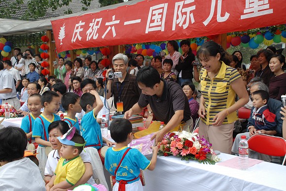 校党委副书记赵平和紫竹院街道办事处主任王京立分别向孩子们和全体教职员工表示亲切的慰问,紫竹院街道办事处向我园孩子赠送了精美的图书和音像制品。赠书仪式冒雨进行,十分感人,有风有雨却隔不住温情与爱心的传递,孩子们满心欢喜,接受心爱的图书并对赠书的领导们表示感谢。