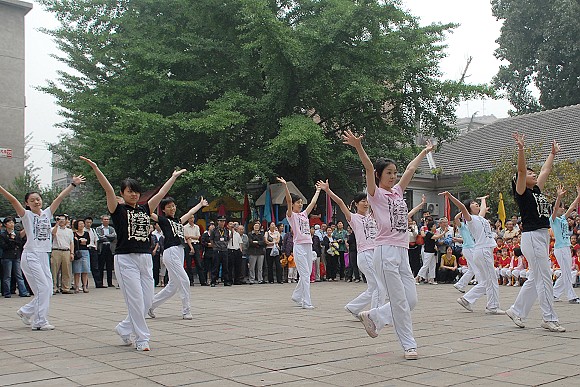 年轻教师以青春的活力与风采,通过健美操《舞动青春》展示健康与运动的和谐及健康与运动的相融相促。
