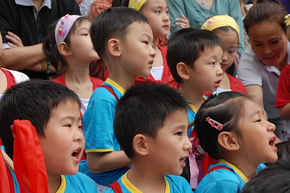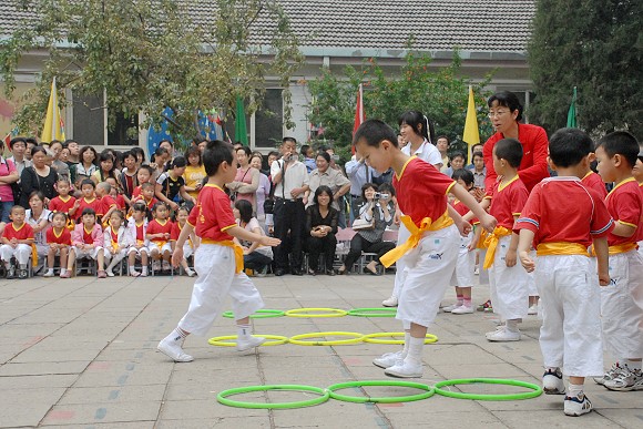 6月1日上午9:00,庆祝大会继续召开。在幼教中心操场上,庆祝会以绿色奥运为主题,孩子们用跳舞、竞技游戏的形式展示他们喜爱运动、积极健身的童真,表达他们企盼奥运的美好心愿。
