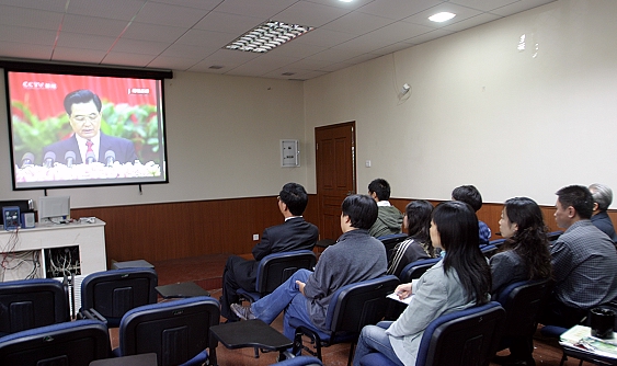 上午九时整,党的“十七大”正式开幕,校党政领导在电视机前认真观看开幕式盛况,聆听胡锦涛总书记的报告。