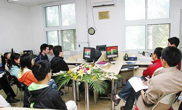信息科学技术学院的同学在实验室收看“十七大”网络直播。