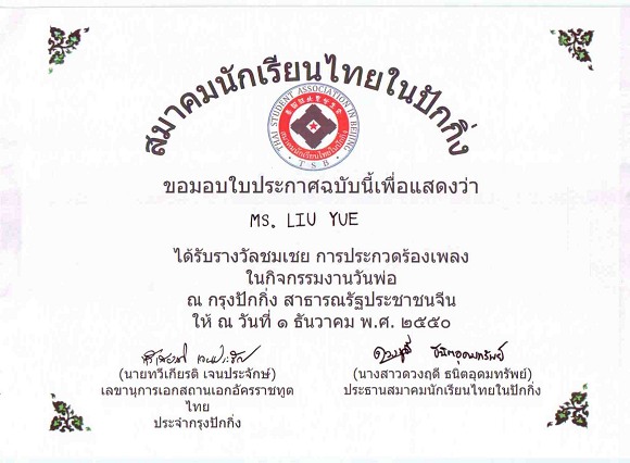 2007年12月初,由泰国驻中国大使馆、泰国驻北京学生会联合举办的“中国人唱泰国歌”大赛在京举行。泰国驻华大使及泰国许多公司的总裁出席此次赛会。