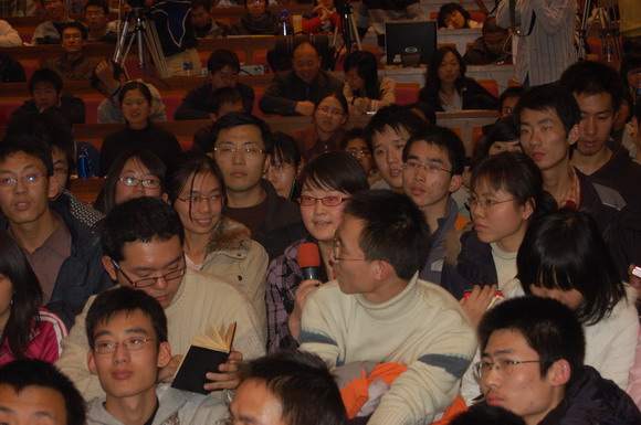 因而在提问环节中,主持人刘明奇部长也分别给了以不同方式听讲座的同学提问机会。其中一个同学问到:“东方的书籍以古老博大著称,但目前这些传统一度被遗忘,似乎百家讲坛的热潮中得到了一定的复苏,但是从中值得借鉴的只有一些普适性的处世道理等;而西方的书籍也都是千篇一律的励志书籍和哈里波特等。希望开复老师能分别推荐一本东方和西方的书。”这个问题立即赢得了全场观众的掌声以及李博士的赞许。李开复老师在回答中为同学们推荐了《老子》和《从优秀到卓越》。整个提问过程气氛非常热烈,李博士对同学们提出的问题一一予以解答,同学们则对每一次解答报以热烈的掌声。