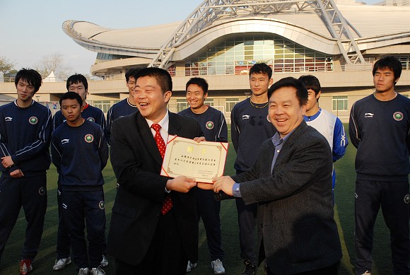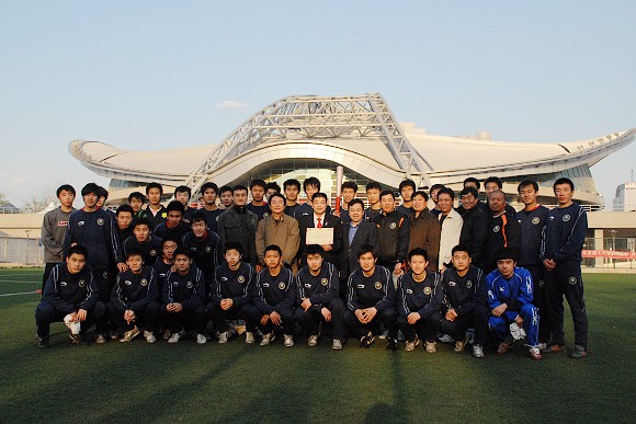 北京爱国者大学生足球队总教练兼领队金志扬、主教练曹限东、澳门太阳城app体育部主任刘启孝以及华旗爱国者公司总裁助理苗俊等领导和相关人员出席了简短的聘任仪式。
