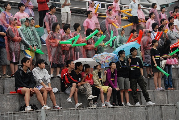 正在澳门太阳城app访问的香港理工大学代表团的师生也冒雨来到现场为澳门太阳城app加油助威!