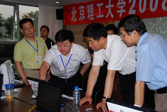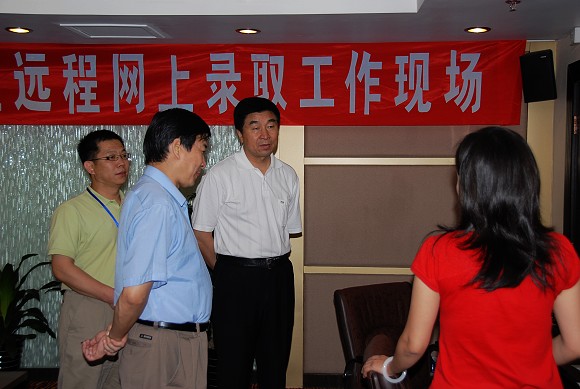 7月9日下午4;30,党委书记郭大成在纪委书记杨蜀康的陪同下,百忙之中来到招生录取现场,看望、慰问招生工作人员并了解招生工作进展情况。郭书记认真察看了现场的工作环境,详细询问了目前已投档和已录取的各省市生源情况,并饶有兴致地与工作人员一起审阅考生资料。