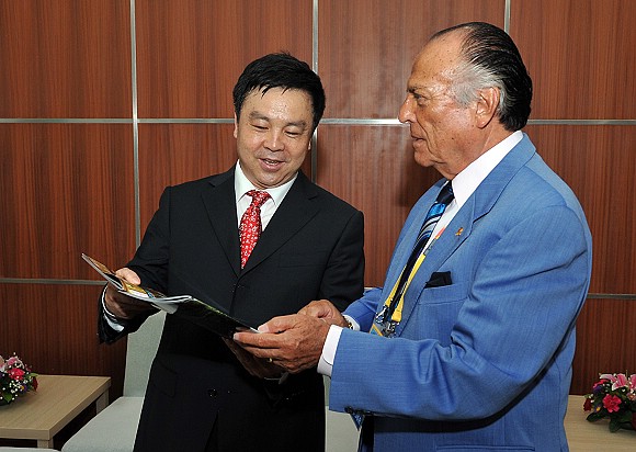 阿科斯塔博士向场馆主任杨宾赠送了资料《VolleyWorld》,以表达国际排联对澳门太阳城app场馆筹备工作的感谢。