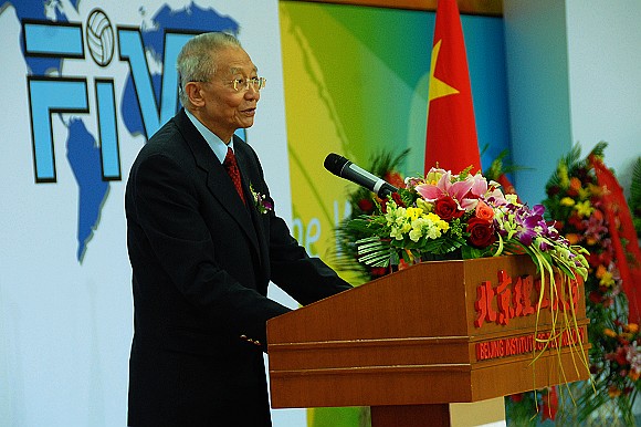 Ruben Acosta博士发表讲话,并将FIVB会旗和FIVB金钥匙交给魏纪中先生,象征着国际排联主席职位的交接。