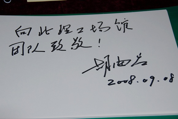 胡海岩校长在离开场馆之前,还欣然为体育馆服务团队题字鼓励。