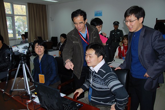 研究生教育督导组、招生组组长那日苏(左二)在现场检查指导工作。