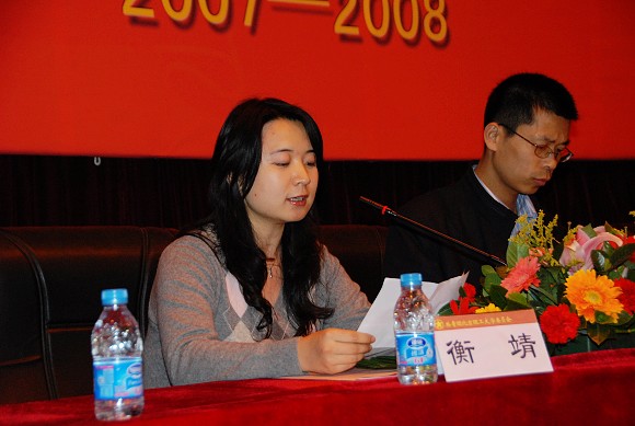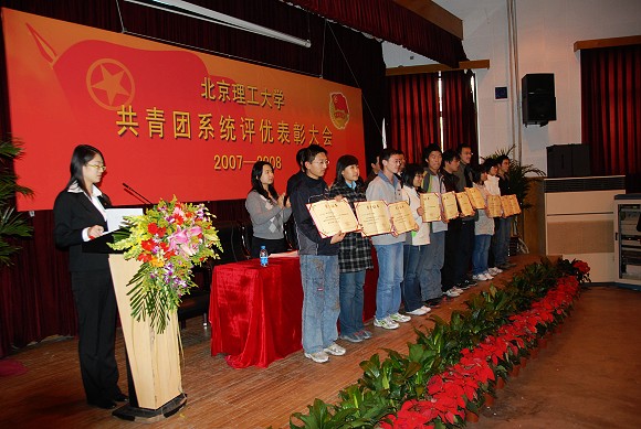会上,校团委书记徐强宣读了我校共青团系统2007-2008年度评优表彰决定。校团委副书记衡靖代表校团委做了本年度评优工作总结。“分团委特色活动”奖获奖单位代表生命科学与技术学院分团委书记王征,“奥运招募培训先进单位”获奖代表设计艺术学院分团委书记周明宇,“十佳团支部”获奖支部代表管理与经济学院08410502团支部吕景舜,“十佳团员”获奖同学代表设计艺术学院栾中群分别就各自所获奖项作了获奖感言。