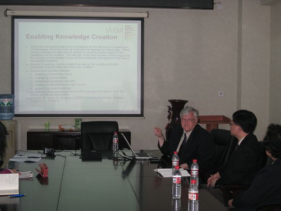 Thomas J. Froehlich教授为我校师生做了题为“Knowledge Management: Intellectual Technologies + Information Technologies”的精彩学术报告。Thomas J. Froehlich教授向我校师生介绍了知识管理在美国的不同方法和研究重点,重点讲述了概述肯特州立大学的在线知识管理计划。Thomas J. Froehlich教授的研究工作新颖而前沿,演讲生动风趣,在我校师生中引起了强烈反响。