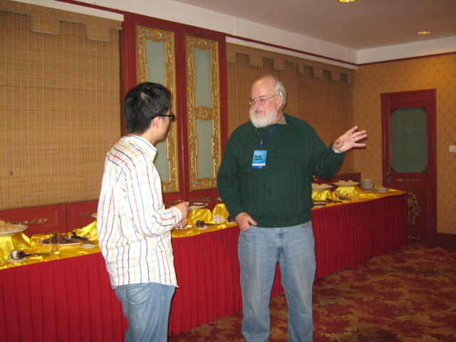 (在接待酒会上与本次大会的Keynote Speaker,Standford University的教授Bebo White交流Web Development相关的话题)