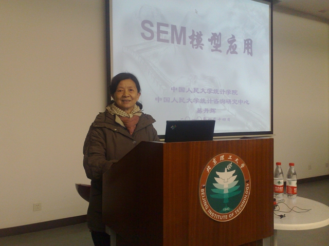 4月14日下午,应管理与经济学院邀请,我国著名统计学学家、博士生导师中国人民大学统计学院易丹辉教授来我校演讲。下午2:00开始,研究生楼102室座无虚席。易教授以“SEM模型应用”为题,用近二个小时间深入浅出地介绍了构建带有潜变量的结构方程模型的基本方法。包括理论模型构建、模型识别、参数估计、模型检验、评价及修正,及结构方程模型的应用,并热情回答了同学们的问题。