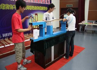 此次大赛的题目为承受运动载荷的不对称双跨桥梁模型设计。进入决赛的22组选手带来了各自精心制作的桥梁模型,决赛中选手要让一个重达15千克的钢制小车顺利通过自己设计制造的桥梁模型。比赛规定模型制作材料为桐木和白乳胶,不允许使用任何其它材料。经过紧张激烈的比赛,最后有4组同学制作的桥梁模型成功通过了小车。