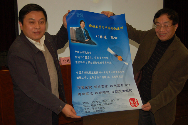讲座中,叶培建院士首先介绍了人类发展航天事业的意义以及国外的研究热点和发展趋势,随后阐述了我国开展探月工程的背景,进而展望了中国未来的探月计划和深空探测计划。在谈到嫦娥工程为什么会取得这么大的成功时,他强调这离不开党和国家领导人的亲切关怀,离不开全国人民的大力支持,离不开航天人特有的航天精神,并列举了在执行嫦娥一号、二号任务过程中大量生动鲜活的例子加以说明。最后,叶培建院士向同学们提出了四点建议:热爱祖国、积极向上、从小事做起、具有团队精神。他希望我校学生能够加入到中国航天人才队伍中来。叶培建院士的整场讲座脉络清晰、内容丰富、感情充沛,对专业问题的讲解深入浅出,博得了在场师生一次又一次热烈的掌声。