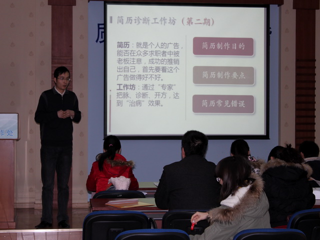 其中,“工作坊”系列就业指导讲座分为“面试工作坊”和“简历诊断工作坊”两大类,主讲老师为校就业指导中心林骥佳、管帅华、刘博联,是学校就业指导中心第一次完全使用自己的师资力量开设的就业辅导课程。在此之前,我校开设就业讲座主要依靠外聘企业人力资源经理或者培训机构的讲师来进行。