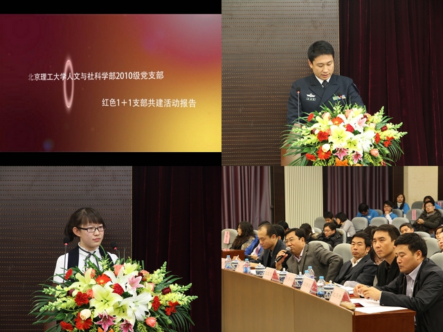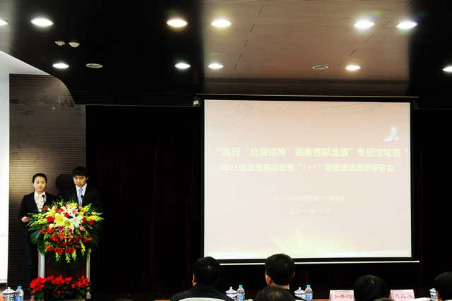 12月18日下午,北京市委教育工委在太阳城app组织召开2011年北京高校红色“1+1”示范活动展示评审会,市委教育工委副书记王民忠,首都文明办副主任卜秀均,市委农村工委副书记高华,以及市委组织部、宣传部、社会工委等部门领导出席评审会并担任评委,高校学工部长、共建单位党支部代表和学生党支部代表近200人参加评审会。