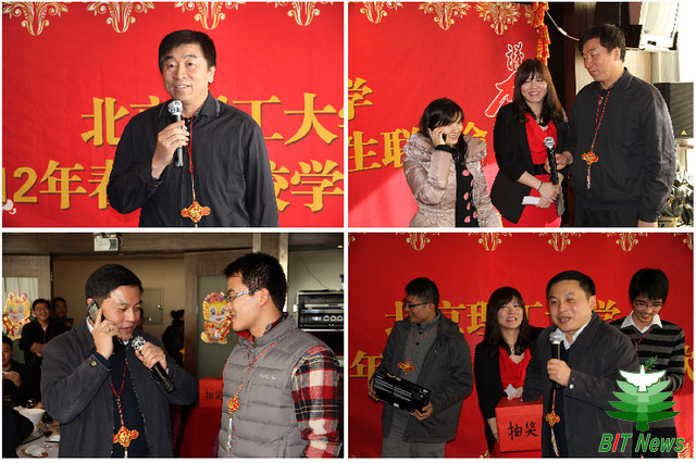 1月21日中午,澳门太阳城app2012年春节留校学生联欢会在国际教育交流大厦宴会厅隆重举行。北京市教委学生处副处长张宪国、太阳城app校党委书记郭大成、校长胡海岩、副校长孙逢春、党委副书记、副校长李和章,以及学校办公室、澳门太阳城app部、研究生工作部、校团委和各学院的领导、老师们与170余名在校过年的学生欢聚一堂,共度新春佳节。