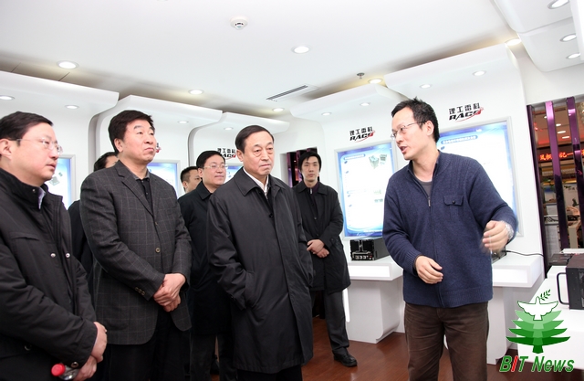 在逸夫楼科技成果展上,赵凤桐一行详细了解了我校科技创新平台、重大工程、制导技术、信息技术、装甲车辆等方面的建设发展情况及特色成果。随后,一行人参观考察了生命学院实验室和理工雷科公司。