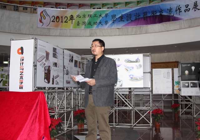 北京工业设计促进会专职副理事长、秘书长宋慰祖先生讲话。他希望两岸同学能够通过此次活动提炼当代设计艺术元素,共同挖掘中华文明的精神内涵,不仅使自己的专业水平得到提高,也从此次活动中汲取到文化的营养,为社会发展贡献自己的智慧。然后,台湾成功大学曾剑峰老师代表来访的台湾师生致辞。他指出,中华文明是两岸同胞文化的共同基石,在中华文明发展的漫长过程中形成了不同地域特色,而此次活动正契合了两岸文化创意产业的政策,希望两岸同学能够精诚合作,以文化为元素,发挥“创意及设计”的力量,突出宏扬中华文化的内涵。