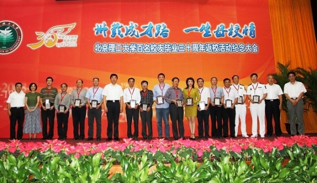 校友发言结束后,郭大成、杨宾、赵显利、李和章上台为校友们按学院一一颁发了“卅载成才路,一生母校情”百名校友荣誉返校纪念牌,其中光电学院刘光灿校友在授牌典礼即将结束时姗姗来迟,意外获得了单独授牌的机会,现场再次爆发了热烈的掌声。