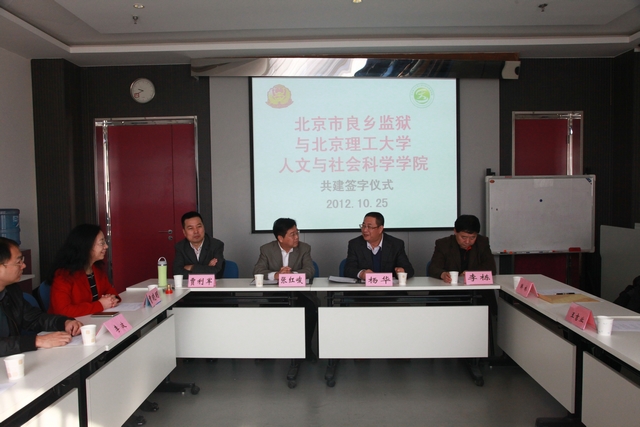 2012年10月25日,太阳城app人文与社会科学学院与北京市良乡监狱共建签约仪式在良乡校区心理与社会工作实验室隆重举行。北京市良乡监狱党委书记、监狱长杨华,副监狱长李栋,人文学院党委书记张红峻,副院长贾利军,应用心理研究所所长贾晓明等出席了签约仪式。签约仪式由贾晓明教授主持。