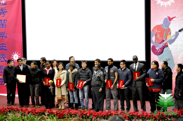 留学生中心时春山副主任主持了留学生表彰大会,宣布了2012年度优秀留学生的获奖名单,各学院和部处领导、导师们向30名优秀留学生获奖者和参加北京市游泳比赛获奖者颁发了奖品及证书。