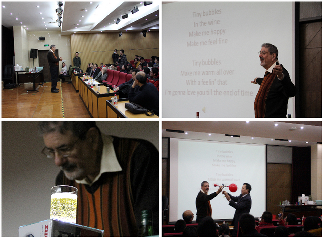 Richard N. Zare教授从我们经常在Drink中见到,但并未引起注意思考其所以然的现象入手,提出一个个极具启发性的问题,调动大家的发散思维,然后一一解答。Zare 教授深入浅出的讲解、平易近人的姿态、幽默诙谐的语言、爽朗的笑声、与现场师生的互动,给师生们留下了非常深刻的印象,现场不时爆发阵阵掌声,其精彩的演示实验更是令在场师生不时发出惊叹。一位世界著名的科学家却始终保持着对我们身边司空见惯的现象所蕴含的化学本质的兴趣和思考,那种孩童般的好奇探索、那种享受科学的乐趣,深深地感染了大家,令师生们回味无穷并深受启发。大家感慨“这个问题我怎么就没有想到呢?”,“啊,原来一个定律可以这样去讲”, “咋们的老师要是这样上课就好了”。