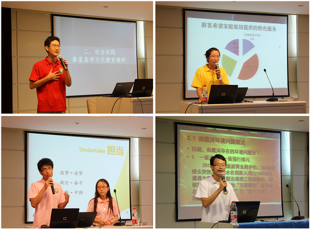 王豪同学和刘丽君老师分别作为学生代表和带队教师代表发言,分享了干训中的收获与体会。他们均表示通过本次干部培训提升了自己的理论水平和工作能力,对今后的工作产生了有效推动。为进一步提高学生理论联系实际的能力,本次干训增加了理论学习环节,组织学员们围绕“矛盾论”、“论认识和实践的关系”、“论中国梦”、“论青年”四单元开展学习讨论,从而提高学员理论水平,培养学员发现问题、分析问题、解决问题的能力。在干训社会实践中,各小组结合“坚定信仰,共筑中国梦”的主题,结合实际运用理论知识对当前北戴河旅游等问题进行系统分析并给出相应对策。结业典礼上,六个小组依次进行了干训期间理论学习和社会实践的成果展示,现场掌声不断。