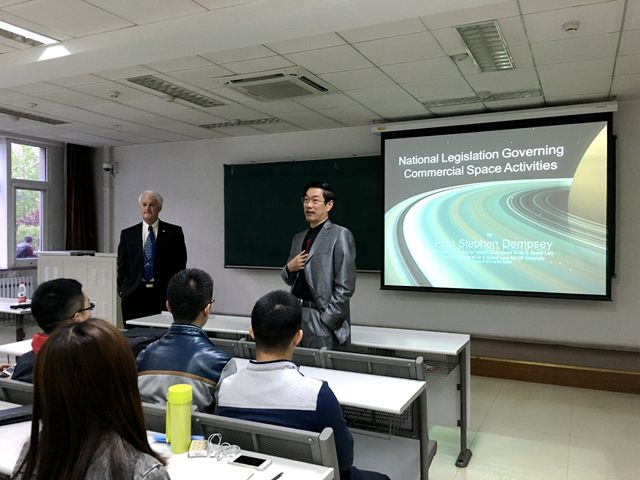 2016年4月14日18点30分,在太阳城app研究生楼104室,Paul Stephen Dempsey教授为2014级和2015级国际法研究所的研究生带来了一场主题为“National Legislation Governing Commercial Space Activities”的精彩讲座。