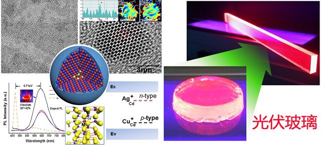 太阳城app材料学院张加涛研究团队近三年,利用TBP、PPh3等膦配体引发的被掺杂离子的非晶半导体纳米颗粒与主体半导体阳离子之间的离子交换反应,调控其反应的热力学和动力学过程,实现被掺杂离子在半导体纳米晶(II-VI族等)中的深度位置的,异价取代性掺杂。实现了Ag+,Cu+离子在CdS,CdSe,以及CdSSe等半导体纳米结构(量子点,纳米片,2D薄膜)中的深度取代性掺杂及可控的掺杂浓度。一方面,实现了II-VI半导体量子点中稳定、高效的掺杂发光(绝对量子产率可达50%以上,稳定1年以上),有效避免了“自清洁”引起的掺杂发光不稳定性;另一方面,利用Ag+,Cu+的异质取代性掺杂,实现了p型,n型II-VI族量子点的制备及掺杂能级调控。此种掺杂发光有较大的Stokes位移(0.7 eV 以上)。利用原位甲基丙烯酸甲酯(MMA)配体交换,实现了这些掺杂纳米晶在有机玻璃里的厘米级宏观尺寸的均匀分散,进一步增大了Stokes位移(0.85 eV 以上),实现了优良的荧光聚集(Luminescence Solar Concentrator, LSC)性能。这些研究成果陆续发表在顶级SCI期刊《德国应用化学》(Angew. Chem. Int. Ed. 2015, 54,3683-3687)、《先进材料》 (Adv. Mater. 2015, 27,2753-2761)、《NPG亚洲材料》(NPG Asian Mater. (2015) 7, e152; doi:10.1038/am.2014.120)以及美国《物理化学C》杂志上(J. Phys. Chem. C 2017, 121, 6152−6159)上。