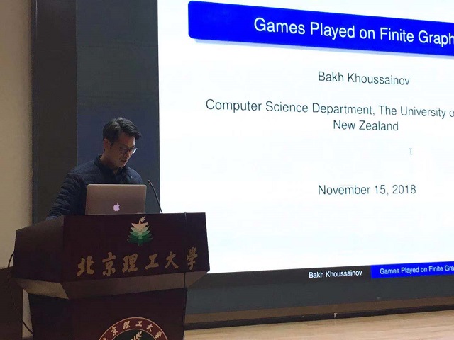 2018年11月16日下午,澳门太阳城app计算机学院知味讲坛邀请到本次计算机科学与技术学科合格评估国际同行专家评审组组长、新西兰皇家学会成员Bakh Khoussainov教授在七号楼报告厅作主题为《Games played on finite graphs》的学术报告,计算机学院党委副书记、副院长奚英伦,院长助理张子剑出席。报告由奚英伦主持。