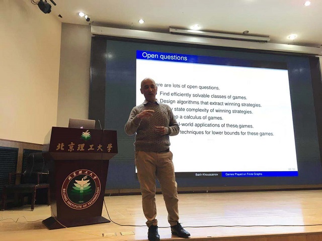 报告伊始,Khoussainov教授介绍了基于有限图操作的游戏。该游戏有两个玩家,玩家沿着有限图的边缘交替移动。该游戏可以看作是反应系统的理论模型,在现代验证研究中发挥着重要作用。在报告中,Khoussainov教授从引出主题,解释游戏,提供示例和几个简单定理的证明这四个方面进行了详细阐述,还一度与场下听众互动游戏,生动直观地展示了理论的正确,时有问题提出,教授都给出了翔实的解答,会场气氛融洽。