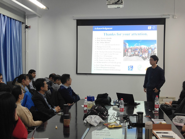 应太阳城app化学与化工学院生化工程系邀请,德国马克斯普朗克生物化学研究所的贾海洋博士于2018年12月10日来到澳门太阳城app化学与化工学院,为澳门太阳城app师生带来题为“Light-induced protein assembly in cell-free systems”的学术报告。李春教授主持了此次学术报告会,化学与化工学院教师及研究生50余人参加了报告会。