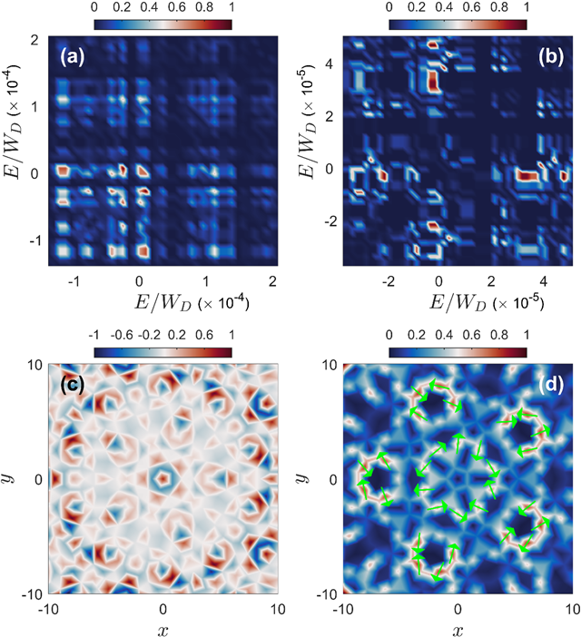 图 态空间超导序参量的模[a, b]和实空间超导序参量[c, d]。[a, c]为单态s波,[b, d]为三重态d波。(d)中的等高图表示序参量的模、绿色箭头表示复数序参量的幅角方向。