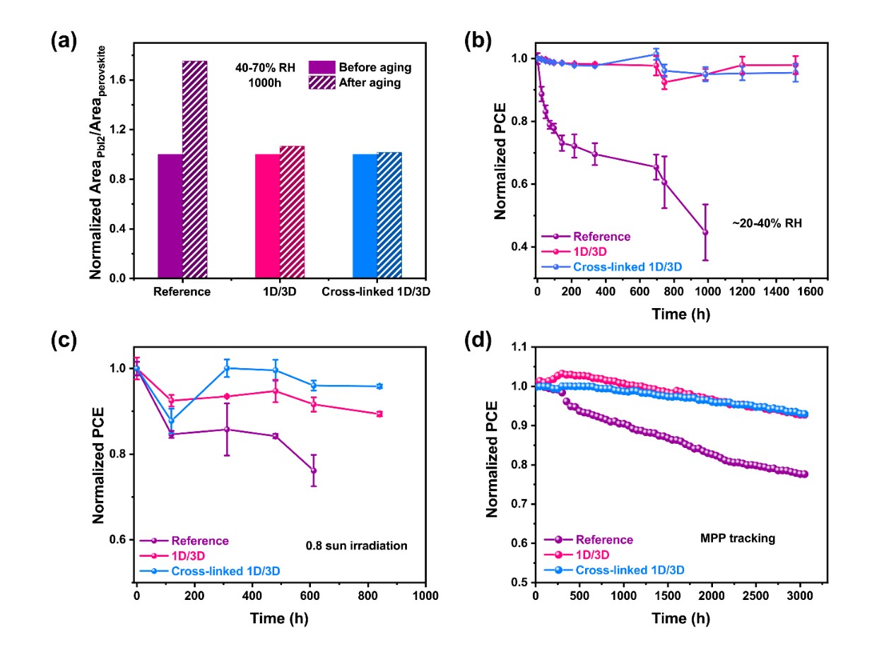 编辑:朱倩云 审核:唐水源 阅读次数:近日,国际化学与材料领域顶级期刊《能源与环境化学》(Energy & Environmental Science,影响因子30.289)报道了太阳城app前沿交叉科学研究院崔彬彬课题组在高效率有机-无机杂化金属卤素钙钛矿太阳能电池稳定性方面的研究新进展,相关研究成果以“In-situ Cross-linked 1D/3D Perovskite Heterostructure Improves Stability of Hybrid Perovskite Solar Cells for Over 3000h Operation”为题在线发表。该工作第一作者为澳门太阳城app博士研究生杨宁,通讯作者为澳门太阳城app前沿交叉院崔彬彬特别副研究员。该工作与澳门太阳城app材料学院陈棋教授课题组共同完成。